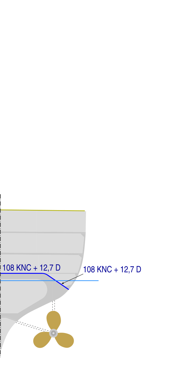 Дополнительно DNC предложил снизить высоту борта, опустив верхнюю палубу, при этом постаравшись разместить между верхней и главной палубами две промежуточные, чтобы увеличить жёсткость корпуса. В носу он предложил разместить отсеки, заполненные водой, которые при необходимости продувались сжатым воздухом и создавали дополнительную плавучесть в оконечностях. Также он считал, что можно уменьшить высоту главного пояса, ограничившись его высотой над конструктивной ватерлинией в 1,53 м, и углубление под воду на 0,69 м. Первоначально было высказано требование иметь обводы как у «Худа», но от него быстро отказались[3].