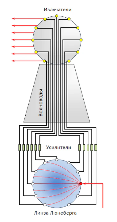На поверхности линзы располагалось несколько тысяч приёмных и передающих элементов. Когда один из передающих элементов формировал на поверхности линзы сферическую радиоволну, линза преобразовывала её в волну с плоскопараллельными фронтами, фазовая картина которой снималась приёмными элементами и транслировалась на сферический излучатель, расположенный на вершине колоколообразной надстройки. Таким образом, сферический излучатель формировал в пространстве луч, направление которого соответствовало положению на линзе излучающего элемента.
