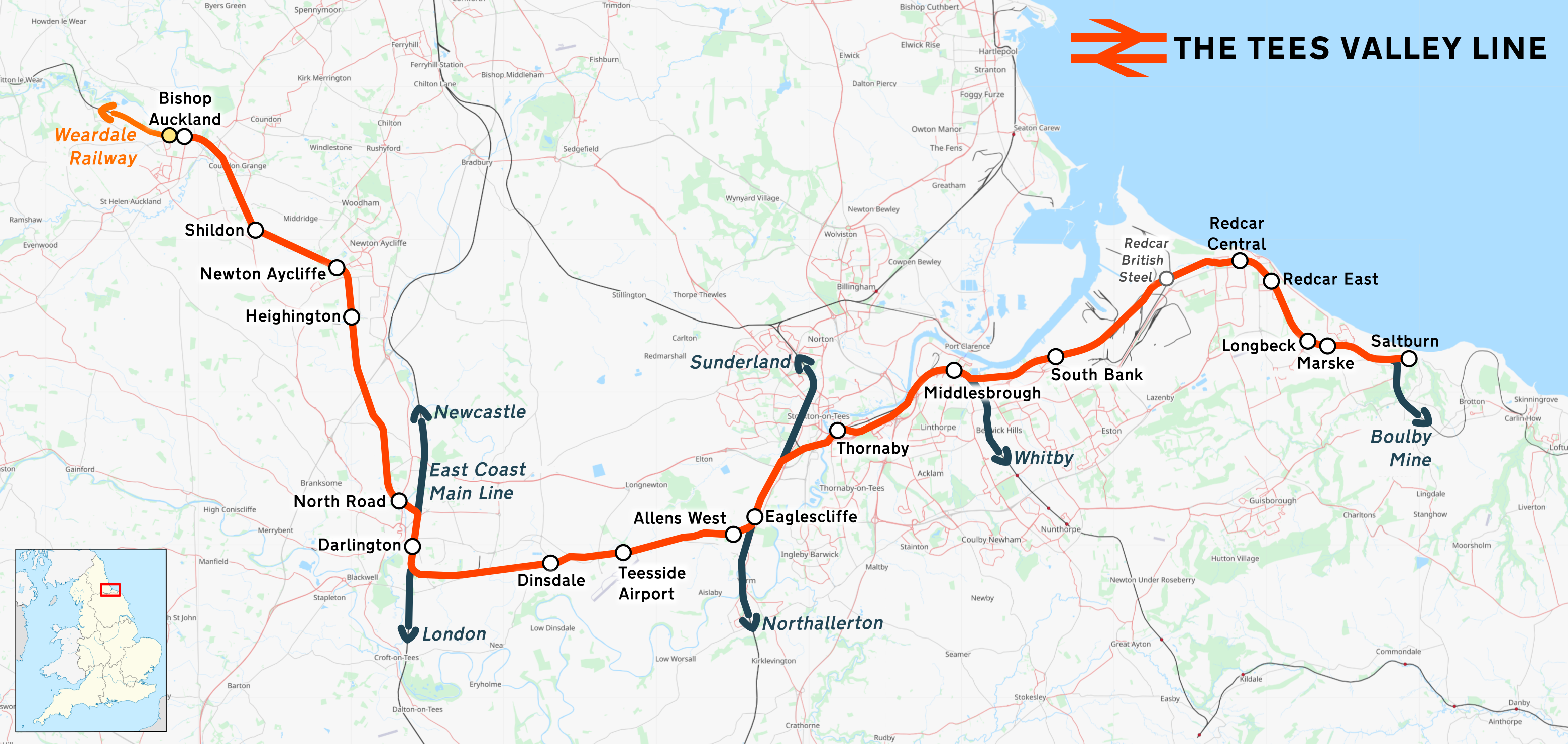 Маршрут линии проходит через станции Bishop Auckland, Шилдон, Ньютон Айклиф, Хайингтон, North Road, Дарлингтон, Мидлтон Сейнт Джордж, Тиссайд (аэропорт), Allens West, Иглсклифф, Торнаби, Мидлсбро, South Bank, South Bank, Redcar East, Longbeck, Marske и Marske.