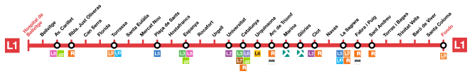 Муниципалитеты, через которые проходит линия 1: Барселона, Оспиталет-де-Льобрегат и Санта-Колома-де-Граманет.