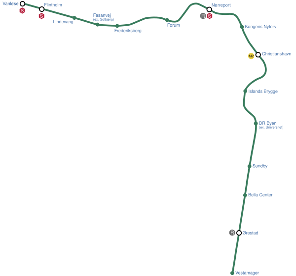 Линия M1 начинается в районе Ванлёсе, где имеется выход к S-поездам (линии C и H). Затем, параллельно линии S-tog Фредерикссунн (дат. Frederikssundbanen), идёт до Флинтхольма, где так же можно пересесть на S-поезд (линии C, F и H). И хотя станция метро Флинтхольм была открыта позже всех станций линии M1 (24 января 2004 года), вкупе со станцией S-tog, железнодорожный узел Флинтхольма является в Дании третьим по величине пассажирооборота. После станции Линдеванг метро уходит в тоннель.