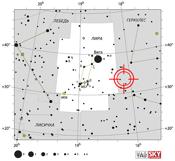 Согласно данным Международного астрономического союза, граница созвездия Лира, соответствующая наименьшему прямому восхождению, пролегает вдоль значения αmin = 273,47° (18h 13m 52,0497s)[13][14]. Таким образом, бо́льшую часть времени радиант Лирид находится в созвездии Геркулес, вблизи границы с созвездием Лира (рис. 1). В течение периода активности потока радиант смещается в сторону созвездия Лира[2]:99.