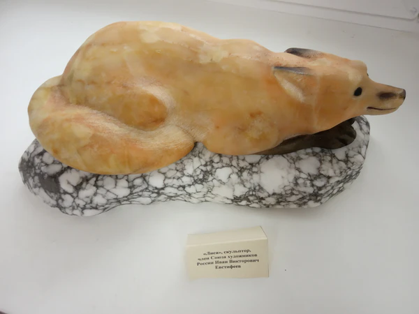 Работа изготовлена из ангидрита рыжего цвета с белыми элементами и серыми разводами. Мастер применил технику резьбы по камню. Этот метод позволяет передать детали шерсти и мимику, обеспечивая высокую точность изображения.