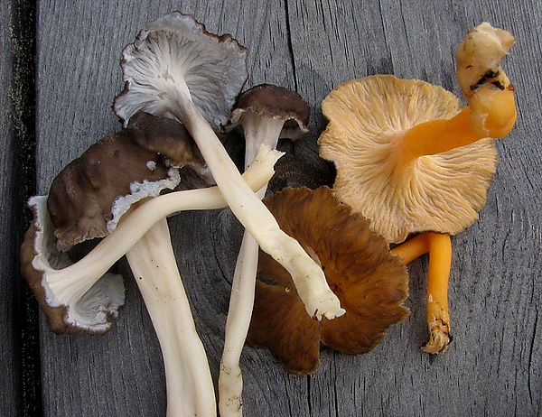 - Cantharellus tubaeformis (Bull.) Fr., 1821 — Лисичка трубчатая — с более развитыми складками на спороносной поверхности.