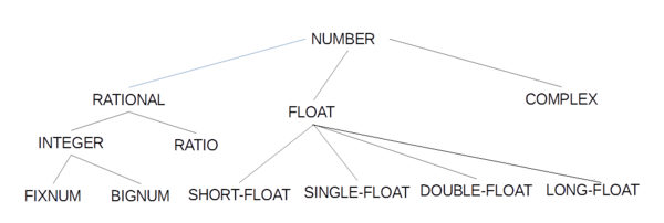 На иллюстрации справа показан фрагмент этой иерархии: надтипом для значений числовых типов является NUMBER, его подтипы — RATIONAL, FLOAT и COMPLEX, — представляют, соответственно, рациональное число, число с плавающей запятой и комплексное число, первый из которых, в свою очередь, имеет подтипы INTEGER (целое число) и RATIO (рациональная дробь), второй — несколько подтипов, представляющих числа с плавающей запятой с разной степенью точности, и так далее.