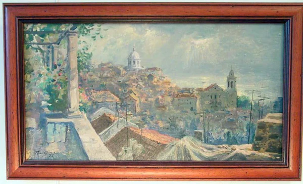 Картина выполнена в традиционной для автора голубовато-серой гамме. Перед зрителем предстаёт панорамный пейзаж Лиссабона, открывающийся с террасы дома: фрагмент последней размещён в левой части композиции, а в центре сюжета — городская панорама с куполами соборов и крышами домов. Вдали, у линии горизонта в правой части картины, виден небольшой участок моря. Художнику удалось передать атмосферу приморского города. Эскиз для полотна выполнен с натуры во время захода барка «Крузенштерн» в порт Лиссабона в 1996 году.
