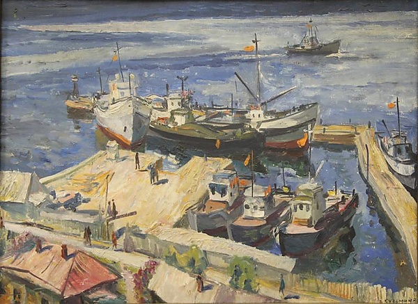 На картине в жанре марины на переднем плане изображена улица с постройками и забором, за которыми расположена пристань. У пристани пришвартовано семь катеров. Позади пристани видна водная поверхность, по которой движется ещё один катер. Композиция построена с акцентом на последовательную глубину пространства.