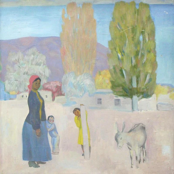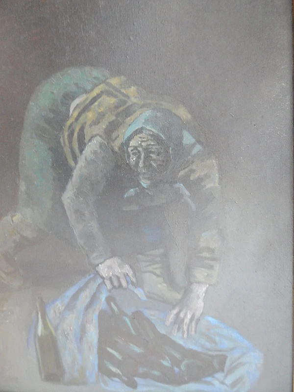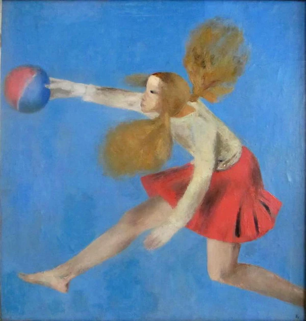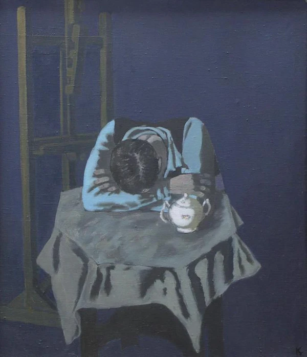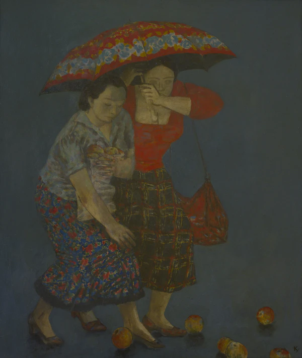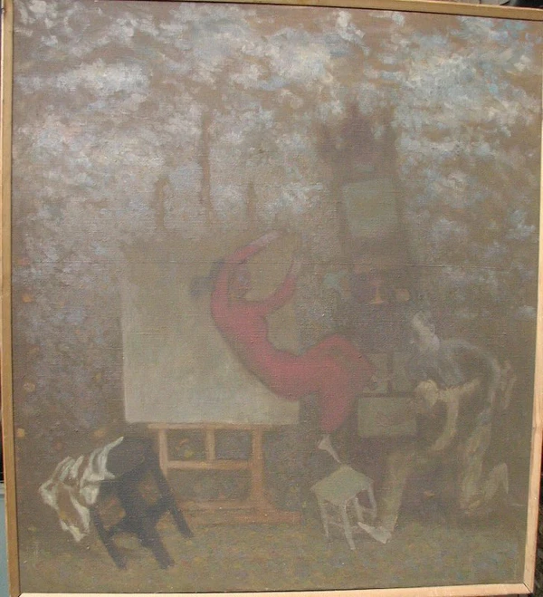 На полотне изображена семейная сцена, разворачивающаяся в интерьере, который плавно переходит в пейзаж с облаками и падающими листьями. В композиции присутствуют падающие предметы мебели, такие как табуреты и шкафы, а также женщина в длинном красном платье, находящаяся в состоянии падения. Мужчина изображён держащим ребёнка, который также падает, на фоне мольберта. Работа выполнена в пастельно-приглушённых оттенках, с использованием гладкой манеры письма.