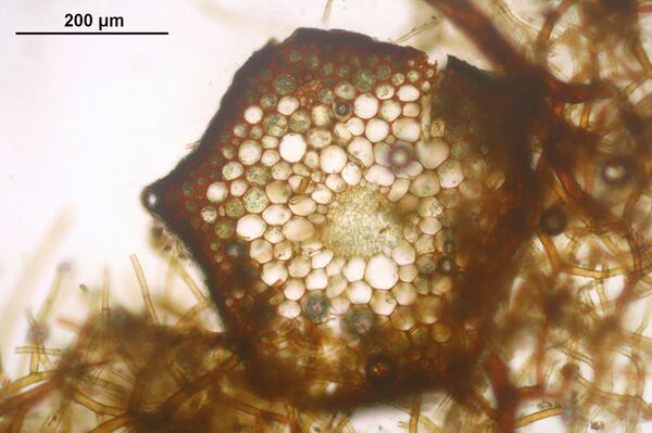 У некоторых мхов наружный слой коры образуют клетки гиалодермы — без хлоропластов, с тонкими, прозрачными стенками и широким просветом.