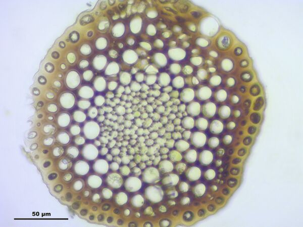 В поперечном разрезе стебель округлый, иногда овальный, угловатый или ребристый. Может быть из однородных клеток, но у большинства мхов состоит из дифференцированных. В последнем случае образуется кора или склеродерма, из механической ткани, внутри которой находится основная, проводящая, ткань. Отмершие клетки внутренней коры образуют снаружи эпидермис, один или несколько слоёв омертвевших клеток без живого содержимого, служащих для сохранения воды.