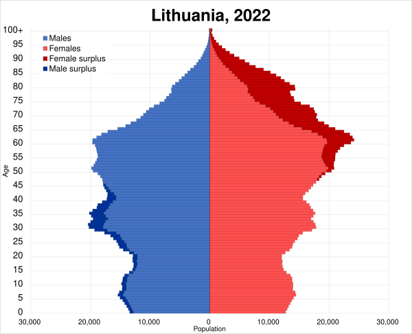 По данным Всемирного банка на 2013−2014 годы, Литва попала в список стран мира, исчезающих быстрее всего. Катастрофическое уменьшение численности населения — 28 366 (1 %) — усугубила стремительная эмиграция жителей, увеличившаяся смертность, спад рождаемости. По разным данным, Литву, с момента обретения независимости и вступления в ЕС (2004 год), покинуло около миллиона жителей. Большинство из них уехало на заработки в страны Западной Европы[25]. По оценкам департамента статистики Литовской Республики, в начале сентября 2015 года в стране проживало 2 898 062 человека[26]. С 1992 происходит депопуляция страны, причиной которой стали как эмиграция, так и отрицательный естественный прирост населения.