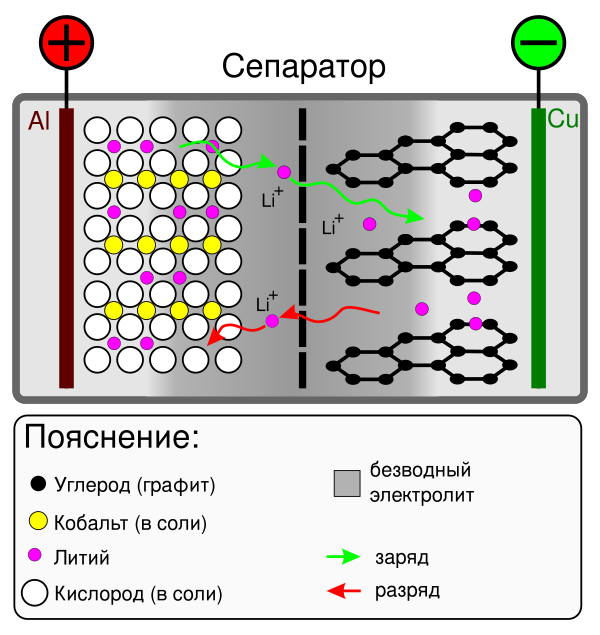 - литий-кобальтовые LiCoO2 + 6C → Li1-xCoO2 + LiC6