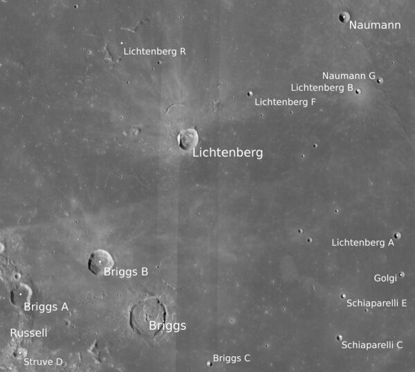 В кратере Лихтенберг наблюдались кратковременные лунные явления в виде пятен красноватого цвета.