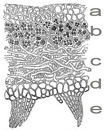 - гетеромерные (Peltigera canina), таллом на поперечном срезе можно чётко разделить на слои.