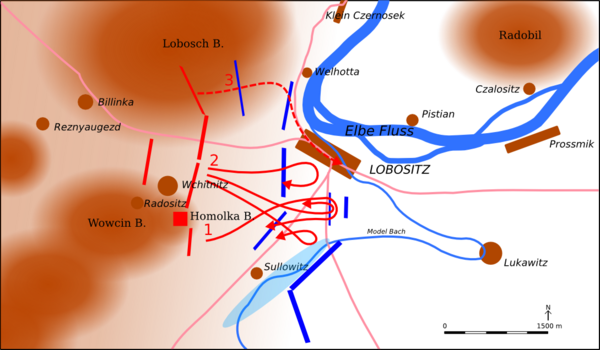 После взятия Лобоша бой разгорелся с новой силой на окраинах Лобозица. Между тремя и четырьмя часами пополудни пруссакам удаётся взять и Лобозиц. Посланный с известием о победе к Фридриху майор, находит того в деревне Билинка недалеко от поля сражения. Лишь с большим трудом ему удаётся убедить короля в правдивости своего донесения.
