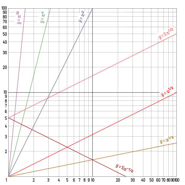 На логарифмической бумаге вид прямых имеют графики степенных функций вида , поскольку путём логарифмирования степенная зависимость приводится к линейной: . Наклон прямой (угловой коэффициент) определяется показателем степени b. При эта функция возрастающая, а при убывающая; при прямая горизонтальна, . Точка пересечения прямой с осью ординат определяется коэффициентом a. В частности, при графики представляют собою прямые, проходящие через начало координат: .