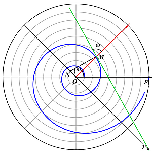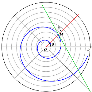 - Угол между радиусом-вектором и касательной сохраняет постоянную величину, то есть . Иными словами, логарифмическая спираль пересекает все свои радиусы-векторы под постоянным углом .