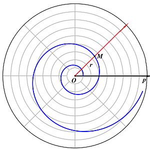 - Когда угол растёт от до , точка делает бесчисленное множество оборотов вокруг полюса, быстро удаляясь от него в бесконечность; расстояния между витками уже не равны. Угол может принимать и отрицательные значения; когда стремится к , то радиус-вектор стремится к . Кривая бесконечное множество раз заворачивается вокруг полюса, безгранично к нему приближаясь (но никогда не достигая); полюс является асимптотической точкой кривой.