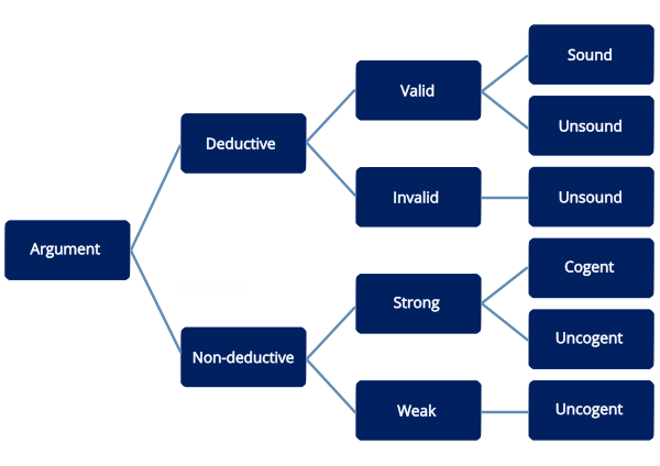 Отдельные типы логических рассуждений отличаются друг от друга в отношении используемых ими норм и достоверности вывода, к которому они приходят. Дедуктивное рассуждение предлагает самую сильную поддержку: посылки обеспечивают вывод, а это означает, что вывод не может быть ложным, если все посылки верны. Такой аргумент называется общезначимым аргументом, например: (1) все люди смертны; (2) Сократ — мужчина; (3) следовательно, Сократ смертен. Для общезначимых аргументов важно не то, истинны ли посылки на самом деле, а лишь то, что, если бы они были истинны, то вывод не мог бы быть ложным. Действительные аргументы следуют правилу вывода, такому как modus ponens или modus tollens. Дедуктивное рассуждение играет центральную роль в формальной логике и математике.