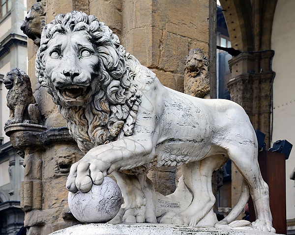 По сторонам центрального входа на постаментах лестницы установлены две скульптуры мраморных львов, опирающихся лапой на шар; один (справа) представляет собой античное произведение I в. н. э., второй (слева) создан (изначально для виллы Медичи в Риме) по образцу первого в 1600 году скульптором Фламинио Вакка (скульптуры установлены в лоджии в 1780 году). Львы символизируют охрану и защиту от вражеских сил (шар — символ бдительности, атрибут «неусыпного стража»). Гипсовые копии и мраморные реплики флорентийских львов разошлись по свету, они установлены во многих зданиях, перед дворцами, в парках и загородных виллах.