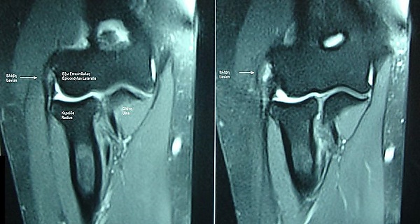 Магнитно-резонансная томография локтевого сустава показана для дифференциальной диагностики неясных случаев. В ходе исследования выявляют повышенную интенсивность сигнала в месте прикрепления сухожилия короткого лучевого разгибателя запястья, утолщение или дегенерацию сухожилия[12]. Самые характерные признаки латерального эпикондилита — утолщение и повышенная интенсивность сигнала в месте прикрепления сухожилия[13].