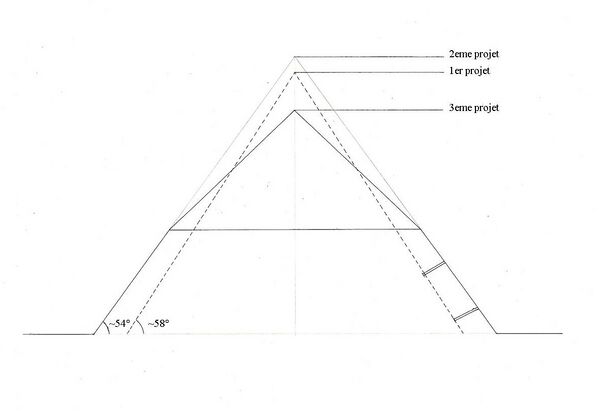 Для повышения надежности конструкции строителям пришлось уменьшить угол наклона до 54°. Вместо песка со щебнем в каркасные пустоты стали заливать только песчано-водную смесь.Соответственно пришлось увеличить и длину стороны основания пирамиды на 15,70 м: теперь общая длина основания стала равна 188 м. Расчеты показывают, что такой длине основания и при угле в 54° высота пирамиды составила бы 129,4 м, а объём — 1 592 718 м3. Однако на высоте 49 м строительство снова прекращается.