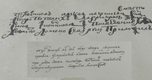 - 1730 — 15 декабря отправился в Москву. Относительно этой даты имеются также несущественные разночтения: в уже упомянутом документе иная — 8 декабря 1725 года («Показание о своём происхождении, данное при допросе в Московской Синодального правления канцелярии» 4 сентября 1734 — ЦГАДА, ф. Московской Синодальной конторы, № 245, лл 16—17); что касается отсутствия единого мнения о самовольном или «дозволенном отцом» уходе, естественно, в официальном документе первый вариант не мог быть указан, и остаётся только верить сведениям самого М. В. Ломоносова о его бегстве; но косвенно документ, воспроизводимый Н. А. Любимовым («в бегах»), это подтверждает. Однако выданный Холмогорской воеводской канцелярией паспорт косвенно же противоречит версии о «бегстве» — документ-то этот выдавался как и сейчас, совершеннолетнему — самостоятельному человеку.