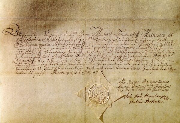 В феврале 1736 года президент Академии наук Иоганн Корф обратился в Кабинет министров с предложением послать несколько способных молодых людей во Фрайберг (Саксония) для обучения их там химии и горному делу. 5 марта Корф в дополнение к своему предложению сообщил Кабинету, что за границу могут быть посланы три ученика, включая М. Ломоносова. 13 марта Кабинет, согласившись с Корфом, издал распоряжение о направлении предложенных им учеников «в Фрейбург к берг-физику Генкелю». Позднее, 15 июня Корф решил направить их сначала на два года в Марбург (Гессен), для того, чтобы они сначала изучили там основы металлургии, химии и других наук. 19 сентября Ломоносов отправился на корабле из Петербурга, 3 ноября прибыл в Марбург и в том же месяце начал слушать лекции по теоретической и практической химии у доктора медицины Конради[39].