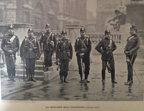 Полк Лондонских ирландских стрелков был образован в 1859 году в разгар Викторианского добровольческого движения как 28-й Миддлсексский (Лондонский ирландский) стрелковый добровольческий корпус (англ. 28th Middlesex (London Irish) Rifle Volunteer Corps)[1]. 8 офицеров и 208 солдат сражались в составе одного из батальонов полка в Англо-бурской войне. Капитан Э. Дж. Конкэннон был награждён орденом «За выдающиеся заслуги», а в знак заслуг полка перед Британской армией ему были отданы первые воинские почести в виде нанесения на знамя наименования кампании South Africa, 1900-1902[2]. С 1908 года Лондонские ирландские стрелки числились в составе Территориальных сил как 18-й (Лондонского графства) батальон Лондонского полка (Лондонских ирландских стрелков)[1].