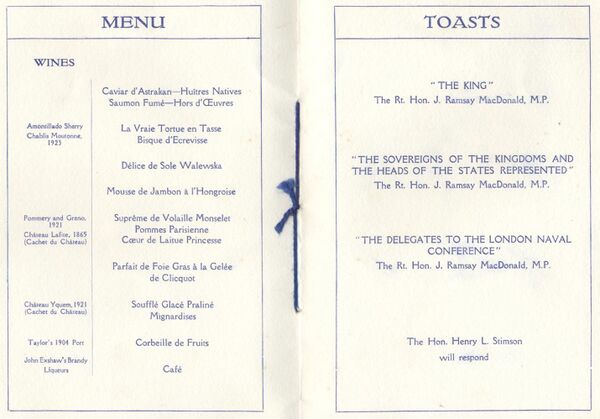 21 января 1930 года в Вестминстерском дворце английский король Георг V торжественно объявил об открытии Лондонской конференции пяти держав по вопросам морских вооружений, на которой США, Британская империя, Франция, Италия и Японская империя должны были установить ограничения для дальнейшего строительства своих военно-морских флотов, а также определить текущие их составы и соотношение общего тоннажа между отдельными странами. Американскую сторону возглавлял государственный секретарь США Генри Стимсон, британскую - премьер-министр Великобритании Джеймс Рамсей Макдональд, японскую - министр флота Японии адмирал Такэси Такараби, французскую - премьер-министр Франции Андре Тардьё, итальянскую - министр иностранных дел Италии Дино Гранди.
