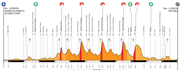 Далее гонщики проходят несколько кругов по холмистой местности в окрестностях Доркинга где расположены несколько категорийных подъёмов, включая Лейт Хилл — самую высокую точку в Юго-Восточной Англии. После этого маршрут возвращается в Лондон где преодолевают последний категорийный подъём Бокс Хилл до того как выехать на плоскую главным образом часть дистанции через Окссхотт, Кингстон-апон-Темс, Уимблдон и Путни. Последние километры гонщики проходят по набережной Темзы мимо Вестминстерского дворца, вдоль Уайтхолла и пройдя после поворота прямо через Адмиралтейскую Арку финишируют на улице Мэлл.