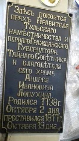 25 марта 2017 года - в год 200-летия со дня кончины Андрея Ивановича и в год 100-летия крушения Российской Империи, попечением кн. В.О.Лопухина была восстановлена и освящена чугунная мемориальная плита его прародителю на стене внутри храма. Одновременно по предложению кн.В.О.Лопухина и его стараниями была сделана реставрация сохранившейся памятной плиты с места погребения игумении Клавдии (1762-1859) – настоятельницы Успенского монастыря, благодетелем которого был А.И.Лопухин. Сия плита была также установлена и освящена в храме Преображения Господня 25 марта 2017 г. Настоятелем сего храма протоиереем Сергием Резухиным перед освящением была отслужена панихида по приснопоминаемым игумении Клавдии и Андрею Ивановичу Лопухину с поминовением его почивших предков и потомков. Плита А.И.Лопухина выполнена, а плита игумении Клавдии отреставрирована Мариной Логуновой.