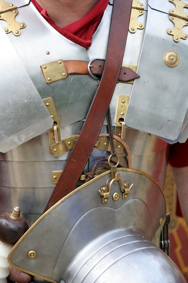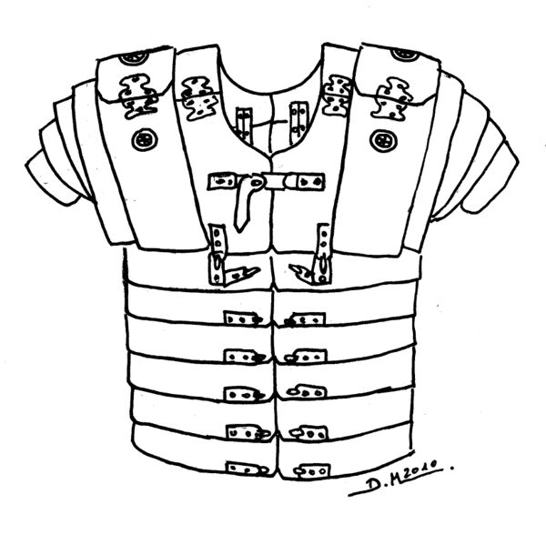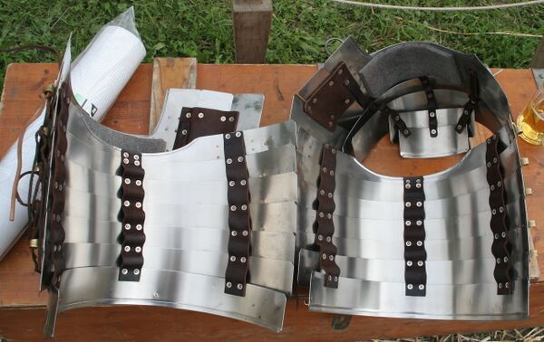 Доспехи состояли из железных полос, изнутри попарно скрепленных на груди и спине кожаными ремнями, образуя таким образом обруч, охватывающий торс солдата. Плечи, а также верхняя часть груди и спины защищались дополнительными пластинами. Нагрудные и спинные пластины крепились к основным либо крючками, либо ремнями и пряжками, располагавшимися на спине внутри доспехов, а на груди — снаружи, так что, очевидно, солдат надевал её лишь наполовину собранной и был вынужден застёгивать спереди сам. Левая и правая нагрудные пластины также соединялись между собой.