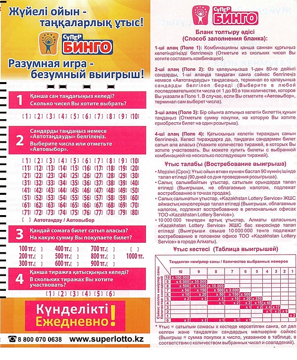 Теоретически максимально возможный выигрыш на одну комбинацию на одном билете среди активных лотерей РК, в которых джекпот фиксирован и не накапливается — 100.000.000 тенге в игре Супербинго, при 10-кратной ставке на 10 чисел из 80. На данный момент максимальный выигрыш в Супербинго составил 10.000.000 тенге (по курсу на тот момент — 65.359 USD) в г. Караганда 30 декабря 2013-го в 1-кратной ставке на 10 чисел.