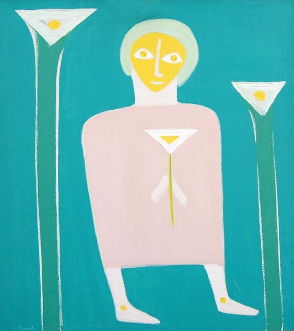 На полотне представлена стилизованная фигура в розовом цвете, изображённая в полный рост на зеленовато-голубом фоне. В композицию включены три лотоса, расположенные на фоне.