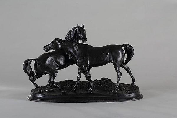 Скульптура выполнена на овальном плинте. На нём изображены фигуры двух играющих лошадей, готовящихся положить головы на спину друг другу.