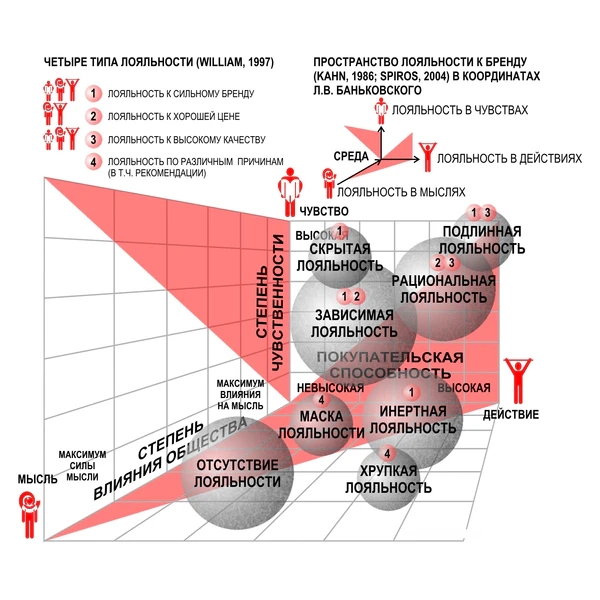 - по отношению и действиям: подлинная, скрытая, хрупкая лояльность, отсутствие лояльности (Kahn, 1986);