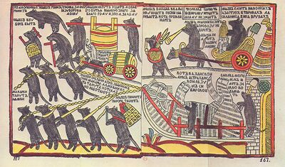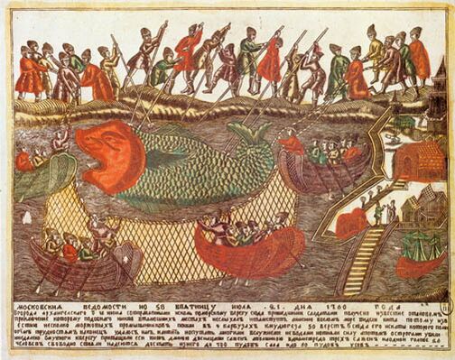 «Немецкие потешные листы» любила знать, включая царскую семью: царевичи и царевны с помощью лубков не только развлекались, но и получали некоторые сведения по истории, географии, естествознанию. В 1677 году придворный органист Симон Гутовский изготовил для царя «станок деревянной печатной, печатать фряжские листы». В 1680 году мастер Афанасий Зверев резал для царя на медных досках «всякие фряжские рези»[12]. В конце XVII века в Верхней (придворной) типографии в Кремле, открытой в 1679 году, был установлен «фряжский стан» (печатный станок) для печати «фряжских листов» на меди.