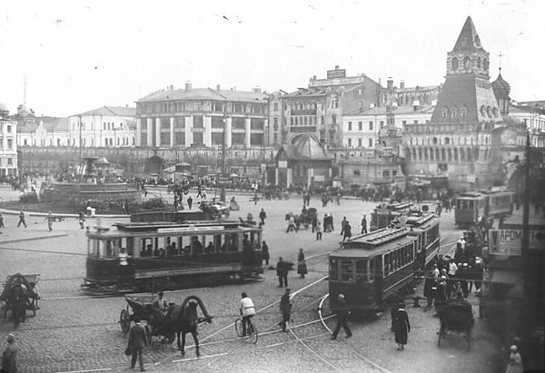 Первоначально на этом месте располагались доходный дом подворья Троице-Макарьева монастыря в Калязине — «Калязинское подворье» (Б. Черкасский переулок, 3; 1905, архитектор Г. И. Макаев) и доходный дом Орлова-Давыдова с магазинами (Никольская улица, 12)[14]. Относительно площади здания находились за Китайгородской стеной — пройти к ним можно было через Проломные (Новые Никольские) ворота[15], которые вели в Малый Черкасский переулок, и Владимирские ворота.