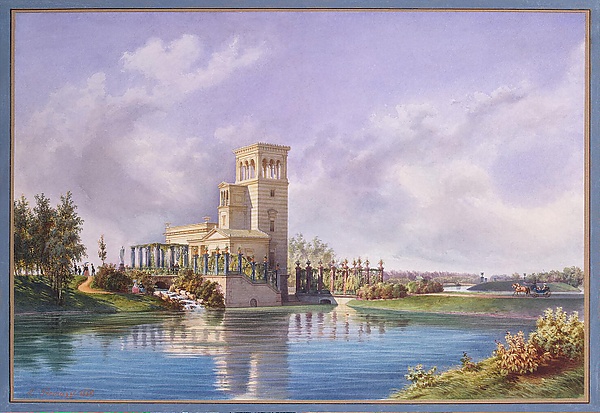 Формирование парка связано с постройкой основных архитектурных сооружений и устройством прудов и охватывает 1825—1857 гг. Все работы по формированию парка велись под руководством А. И. Штакеншнейдера, инженера М. И. Пилсудского и садовых мастеров П. И. Эрлера и П. Г. Архипова. Самой первой постройкой в парке был деревянный Никольский сельский домик (1835 г.)[1], за который А. И. Штакеншнейдер получил звание академика архитектуры. По его проектам были также сооружены павильон «Озерки», Бельведер, Мельница, «Руина» и церковь святой Александры, множество мостов, караулок, плотин, шлюзов, устроены пруды[2].
