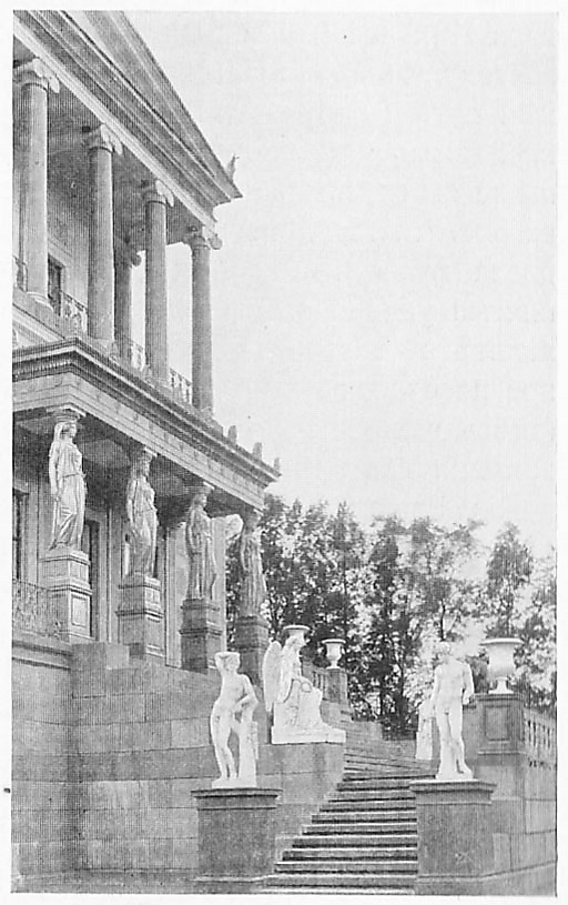 По сторонам здания в 1856 г. были установлены на высоких постаментах две гальванопластические группы П. К. Клодта «Укротители коней». Эту композицию зодчий дополнил не свойственной античности террасой с декоративными вазами и каменной двухмаршевой лестницей с такими же вазами и скульптурой на постаментах. Во время Великой Отечественной войны скульптурные группы Клодта безвозвратно исчезли.