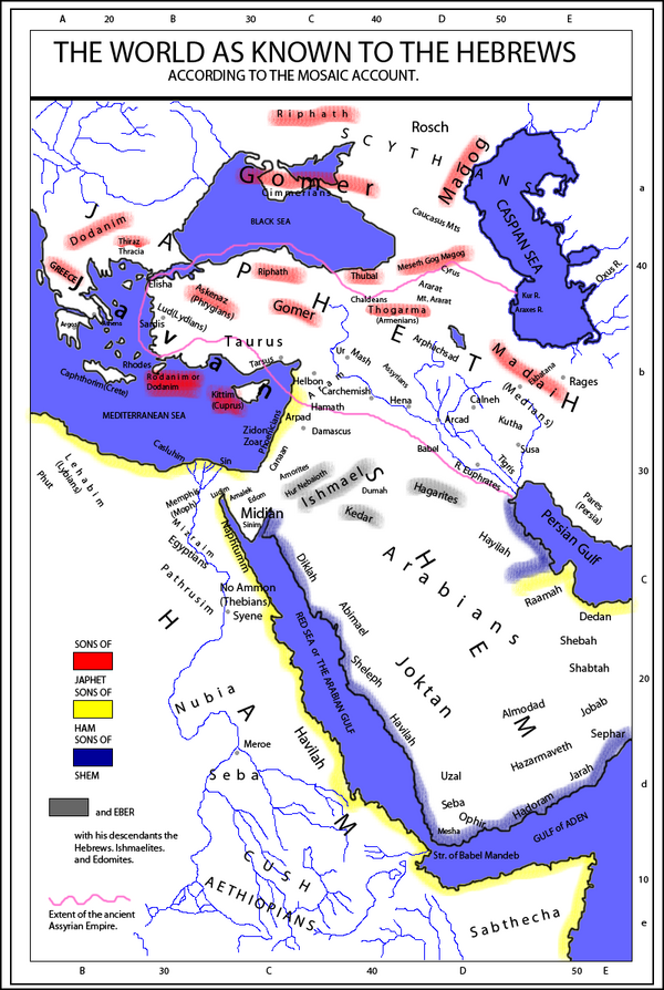 Географическая идентификация потомков Ноя по Иосифу Флавию, около 100 года н. э. (указаны зелёным цветом). Он написал: Лудиты — люди Луда, от которых происходит название Лидия[2]
