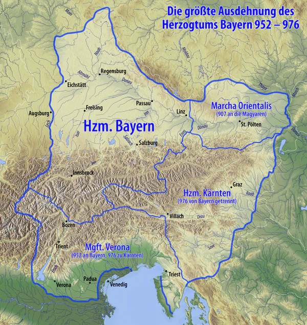 Передача Баварии представителям Саксонской династии повлекла за собой длительный конфликт между Луитпольдингами и Людольфингами (второе название Саксонской династии). Вероятно, что потеряв Баварию, Генрих Младший всё же удержал часть своих владений в Каринтии, что позволило ему сохранить свои позиции в империи. Конфликт баварской линии Людольфингов с императорами Священной Римской империи привёл в 976 году к разделу Баварии: от герцогства были отделены все восточные и южные марки от Вероны до Чехии, из которых было сформировано два новых государственных образования: Восточная марка (будущая Австрия) на севере, и герцогство Великая Карантания на остальных приграничных землях. Правителем Великой Карантании стал Генрих Младший.