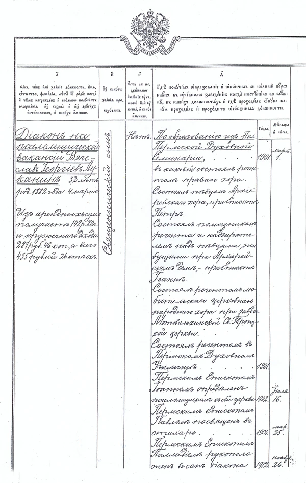 5 (18) июля 1914 г. диакон Вячеслав Луканин получает очередную благодарность от благочинного 1-го округа Соликамского уезда протоиерея Николая Орлова «за умелую и прекрасную постановку хора».