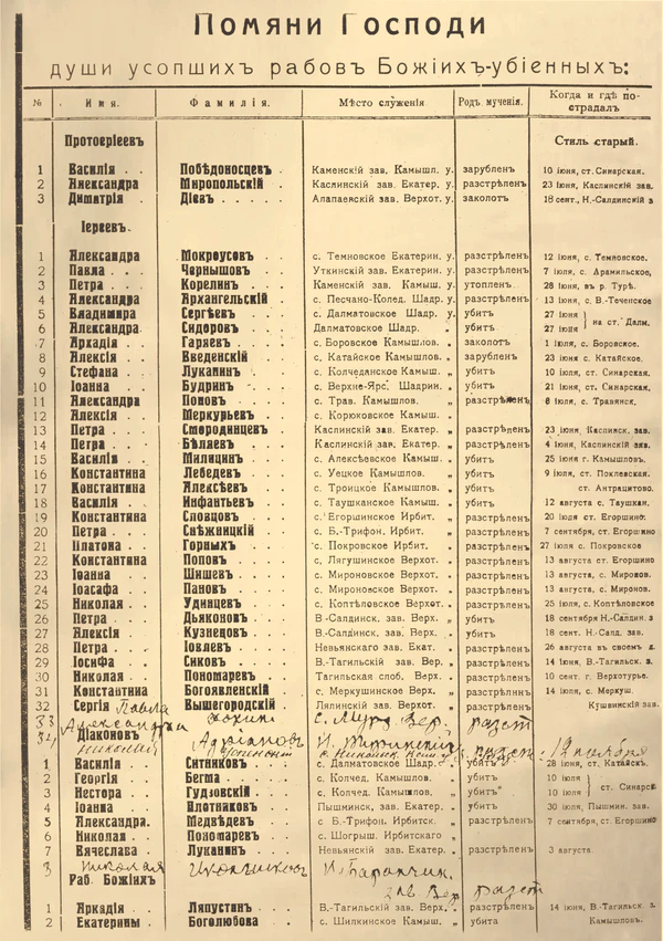 Рядом с храмом, на углу дом священника отца Николая и его дочери Аглаи, их расстреляли в первую очередь. У купчихи дворник Иоганн берет двух коней и едет верхом за отцом к храму, на берег пруда, но в храме уже красноармейцы. Дворник прячется в большой летней усадьбе купчихи, что на пригорке, рядом с храмом, идет 1918-й год. Он наблюдает, как арестовывают отца, и с ним ещё семь человек. Их расстреляли в Невьянске на вокзале. Могилу копали себе сами за вокзалом, одного молодого отпустили, выстрелив ему в ногу».