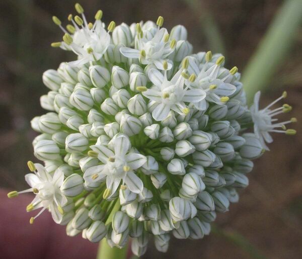 Цветёт в июне-июле. Цветочная стрелка высотой от 50 до 180 см, трубчатая, со вздутием в средней части, развивается из зачатков, оканчивается многоцветковым соцветием. Соцветие — шаровидный зонтик из 250—800 цветков правильной симметричной формы на длинных цветоножках. До распускания цветков соцветие находится в чехле (тонкой оболочке). Лепестки — зеленовато-белые или белые, с шестью тычинками. Иногда в соцветии, кроме цветков, образуются мелкие луковички[7].