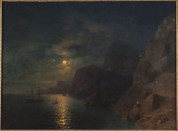 Полотно выполнено в жанре марины и изображает ночной пейзаж с морем, по которому плывут парусные суда и лодки. В верхней части композиции жёлтая луна, окружённая облаками, отбрасывает отражение на водную гладь, что подчёркивает игру лунного света на поверхности моря. На втором плане видны серые горы, дополняющие атмосферу ночной сцены.