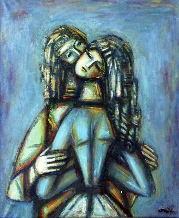 На поя́сном изображении художника А. Тышлер юноша обнимает и целует в щёку девушку, изображённую со спины. Голова девушки приподнята, её длинные волосы ниспадают по плечам, узкая талия и сложенные впереди руки акцентируют изящность силуэта. Колорит полотна представлен сочетанием сине-зелёных и розовых тонов.