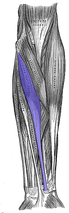 Производит сгибание кисти, а также может отводить её в лучевую сторону в комбинации с другими мышцами[2].