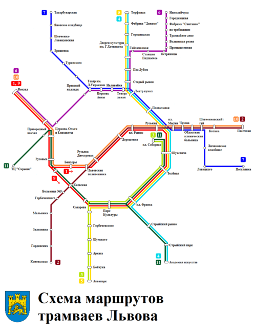 | 1 | Главный ж-д. вокзал > пл. Кропивницкого > НУ "Львовская политехника" Главпочтамт > центр (пересечение с пр. Свободы) > пл. Рынок - ул. Подвальная > ул. Лычаковская — ул. Мечникова - Погулянка, 7,0 км (здесь и далее в одном направлении). Временно с 29.08 до 15.10.22 г. из-за ремонта подпорной стенки на развилке маршрутов №№ 1 и 2 перед НУ "Львовская политехника" от ул. Повальная вагоны следуют через ул. Гонты, Торговую пл., ул. Городоцкую до пл. Кропивницкого | |